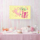 Un joyeux cochon sur une bannière d'anniversaire. Utilisez "Personnalisez ce modèle" et modifiez le nom et l'âge, en créant un élément unique et customisé. Une bannière avec un cochon brillant, sous un gâteau de couche de teetering avec des éclats de glace verte et surmonté de bougies roses.