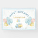 Celebrate your little one’s first birthday with this dump truck birthday banner! Featuring a cute truck carrying gifts and balloons with a soft baby blue gingham pattern (checkered) and dotted borders, it’s perfect for a boy’s first birthday party. Fully customizable with name and age, this banner adds a festive and coordinated touch to your celebration.