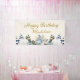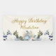 Bannière d'anniversaire "Joyeux anniversaire" aux couleurs bleu et blanc, roses et verdoyantes, élégante et poussiéreuse. Personnalisé avec le nom de l'invité d'honneur. Contactez-moi pour obtenir de l'aide sur vos personnalisations ou pour demander des produits Zazzle correspondants ou coordonnés supplémentaires pour votre groupe.