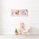 Créez une bannière d'accueil unique en couleur or rose et rose pour la fête de remise des diplômes avec d'élégantes fleurs roses et une photo en forme de coeur dans un cadre de couleurs or rose, le dicton Bienvenue à la fête de graduation qui est décoré avec des illustrations de casquette et de diplôme de l'étudiant. Téléchargez une photo et tapez le nom de votre élève, le nom de l'école, l'année de l'événement en utilisant le modèle avant de commander. Si des ajustements sont nécessaires, veuillez également les faire à l'intérieur de l'outil de conception avant de commander.