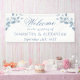 Une bannière de bienvenue Mariage simple et délicate avec des feuilles floral bleu poussiéreux et doux entourant les noms de la mariée et du marié avec un script élégant. Délicats feuilles pour célébrer votre importante journée en harmonie avec la nature. Vous pouvez modifier le texte à partir du menu Personnaliser et le customiser plus loin avec les outils fournis. Si vous avez besoin d'aide et pour d'autres produits correspondants, veuillez me contacter.