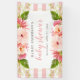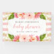 Élégante bannière d'accueil/d'affichage baby shower avec un texte de script gris et rose qui peut être personnalisé avec le nom, le titre de l'événement et la date de la future mère. L'écriture est encadrée par un joli arrangement floral aquarelle avec feuillage vert et rose pastel, rose, rougit, fleurs de printemps pêche et rose, ainsi qu'un cadre doré décoratif. Un motif de bandes horizontales blanches et roses de ballet clair accentue le design.