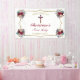 Célébrez la joie de la première sainte communion de votre fille en accueillant les invités à la 1ère réception de la sainte communion de votre fille avec cette belle rose rouge florale 1ère sainte communion bannière d'accueil. Cette banderole de bienvenue chic pour la communion sainte d'une fille présente un grand cadre doré avec une belle croix en bois qui a un bouquet de rose rouge et rose. Des bouquets de roses rouges et crème sont placés dans chaque coin. Personnalisez avec le prénom de votre fille.