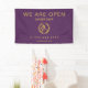 Salon de coiffure pour hommes publicité bannière signe en faux or et violet avec un élégant script typographique. +++++++++++++++ Facilité de personnalisation avec votre message principal (nous sommes ouverts), votre nom d'entreprise, logo, numéro de téléphone pour les rendez-vous et le site Web.