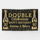 Double célébration signifie doubler le plaisir ! Une étonnante bannière d'anniversaire en noir et or pour une fête d'anniversaire conjointe. Avec deux bouteilles de champagne d'or avec leur âge sur un arrière - plan noir, décoration de parties scintillant d'or et le texte 'double célébration' 'Joyeux anniversaire' et leurs noms.