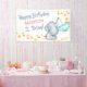 Personnalisez cette jolie bannière de fête d'anniversaire pour votre petite fille. La conception a une aquarelle illustration d'un bébé éléphant attrapant des étoiles tombantes et les coeurs d'amour dans un parapluie. Le texte dit "joyeux anniversaire [nom] [âge aujourd'hui!]" que vous pouvez customiser pour votre enfant. Un design doux et capricieux avec une palette de couleurs de corail et gris.
