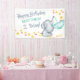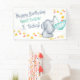 Personnalisez cette jolie bannière de fête d'anniversaire pour votre petit garçon. La conception a une aquarelle illustration d'un bébé éléphant attrapant des étoiles tombantes et les coeurs d'amour dans un parapluie. Le texte dit "joyeux anniversaire [nom] [âge aujourd'hui!]" que vous pouvez customiser pour votre enfant. Un design doux et capricieux avec une palette de couleurs turquoise et gris.
