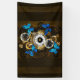 Composition de l'horloge ronde steampunk avec cadran romain noir, décoré avec des engrenages or et laiton, papillons Morpho bleu et lentilles endommagées sur arrière - plan rayé brun. Style Steampunk.