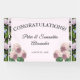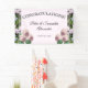 Ajoutez cette élégante bannière Mariage en fleurs d'été Hydrangea à vos accessoires de réception. Décoré dans des tons doux de rose, vert et lilas, avec une bordure rose-lilas en été. Le texte comprend : FÉLICITATIONS!, les noms des couples et la date du Mariage. Pour personnaliser, remplacez simplement l'exemple de texte en utilisant notre modèle pas à pas facile. N'oubliez pas de consulter la collection de Mariages Summer Hydrangea Blossoms pour les cartes et accessoires correspondants.