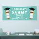 Banderole de graduation de pharmacien créative pour la fête de groupe de l'école de pharmacie avec des bouteilles de prescription en casquette noir et or. Modifier le texte pour ajouter le nom et l'année.