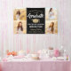 Ajoutez une touche personnalisée aux décorations de la fête de remise des diplômes de l'université ou du lycée avec cette bannière personnalisée 4 photo collage noir, or et blanc. (CONSEIL EN MATIÈRE DE PLACEMENT D'IMAGE : Une façon simple de centrer une photo exactement comment vous voulez est de la rogner avant de la télécharger sur le site Zazzle.) Le design comprend une planche de mortier à faux papier, une typographie moderne élégante, une calligraphie manuscrite de style script, et quatre photos du diplômé, telles que des images de haut niveau ou des images de la cérémonie de début. Veuillez noter que l'or est imprimé en couleur et non en métal. Ce signe de fête est une façon élégante de célébrer la journée spéciale. Félicitations au diplômé !