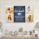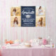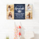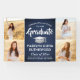 Ajoutez une touche personnelle aux décorations de fête de fin d'études universitaires ou de lycée avec cette bannière personnalisée à 4 photos avec un dégradé de bleu, blanc et argent. (CONSEIL DE PLACEMENT D'IMAGE : Un moyen facile de centrer une photo exactement comme vous le souhaitez est de la rogner avant de la télécharger sur le site Web de Zazzle.) La conception présente un fond à effet ombré bleu, une casquette de diplômé en faux acier inoxydable brossé, une typographie moderne élégante, une calligraphie de style manuscrit et quatre photos du diplômé, telles que des photos de fin d'études ou des images de la cérémonie de remise des diplômes. Veuillez noter que l'argent est une couleur imprimée, pas une feuille métallique. Ce panneau de fête est un moyen élégant de célébrer ce jour spécial. Félicitations