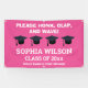 Ajoutez aux festivités de graduation d'un diplômé pendant les temps Coronavirus avec ceci s'il vous plaît klaxonner et saluer bannière rose! Si vous ne pouvez pas avoir de fête de remise de diplômes, alors faites une parade de voiture ! Personnalisez avec le nom du diplômé, l'année de diplôme, le nom de l'école ou d'autres messages personnalisés.