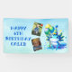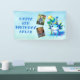 Bannière personnalisée sur le thème Axolotl bleu et vert pour la fête d'anniversaire du garçon. Un axolotl mignon dans un casquette d'anniversaire avec des ballons.