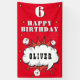 Bannière de toile de fond de fête d'anniversaire garçon nuage de parole de bande dessinée de super-héros. Bannière d'anniversaire de super-héros rouge amusante pour garçons. Ajoutez votre nom et âge.