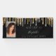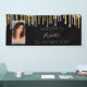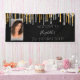 Une bannière pour une fête d'anniversaire de 21ème anniversaire, jeune fille et glamour (ou tout âge). Un arrière - plan noir chic avec des gouttes de parties scintillant en faux or et argent à la mode, la peinture goutte à goutte. Personnalisez et ajoutez votre propre photo verticale de la fille d'anniversaire. Avec le texte : Bienvenue à. Ajoutez un nom et un âge ou un texte. Le nom est écrit dans un script de style moderne écrit à la main. Lettres gris clair.