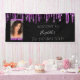 Une bannière pour une fête d'anniversaire de 21ème anniversaire, jeune fille et glamour (ou tout âge). Un arrière - plan noir chic avec des gouttes de parties scintillant violet tendance, la peinture goutte à goutte. Personnalisez et ajoutez votre propre photo verticale de la fille d'anniversaire, nom et âge. Le nom est écrit dans un script de style moderne écrit à la main. Avec le texte : Bienvenue à. Lettres blanches.