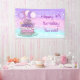 Ajoutez le nom de votre fille à cette jolie bannière d'anniversaire violet et rose avec un gâteau d'anniversaire et des ballons dessinés à la main.