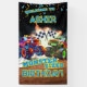 Attachez vos ceintures pour une fête d'anniversaire monstre ! Cette bannière à fort impact présente deux camions monstres rugissants - un orange, un vert - en train de courir sur une piste de terre avec des drapeaux à damier, des confettis et des nuages de poussière. Personnalisez-la avec le nom de votre enfant pour créer un centre de table de fête passionnant qui convient parfaitement aux tout-petits amateurs de camions et aux célébrations à haute énergie