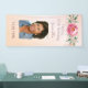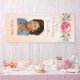 Une bannière verticale pour une fête d'anniversaire girly et glamour de 50ème (ou tout âge). or rose, fond en dégradé rose vif. Un grand rose rose aquarelle, des feuilles verts, un feuillage avec de petites fleurs dorées. Un ruban à goutte en faux parties scintillant or rose derrière les fleurs. Personnalisez et ajoutez une photo de la fille d'anniversaire. Texte : Modèles pour le texte, le nom et une date. Idéal à la fois comme bannière de bienvenue ou comme décor de fête.