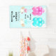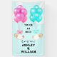 Bannière de décoration de fête de bébé jumeaux avec une fille jumeau et un garçon jumeau sous des bouquets de ballons roses et bleus. Pour personnaliser, modifiez le texte pour ajouter des noms.