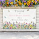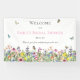 Célébrez et accueillez vos invités de la fête de mariage avec cette bannière de bienvenue estivale et moderne aux fleurs sauvages. Elle présente un champ aux couleurs vives de délicates fleurs sauvages avec des papillons, des bourdons et des coccinelles. Personnalisez tout le texte et l'emplacement des graphiques selon vos besoins.