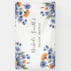 Ce bouquet floral à l'aquarelle saisissant présente des fleurs orange vibrantes associées à des fleurs bleu cobalt riche, peintes à la main dans un style doux et aéré. Attaché avec un ruban neutre flottant, ce design allie couleur audacieuse et texture élégante à l'aquarelle.