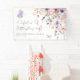 Bannière horizontale pour une Baby Shower "Une vie de papillons". Ajoutez une touche de romance fantaisiste à votre baby shower avec cette charmante bannière horizontale, parfaite pour une célébration sur le thème "Une vie de papillons". L'illustration présente un mélange délicat de fleurs sauvages aquarelles et de verdure, avec de multiples papillons roses et violets voltigeant sur la mise en page. La palette de couleurs comprend des tons rose saumon, rose poussiéreux, lilas, lavande, violet et des verts frais pour un look doux et inspiré du jardin.