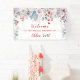 Belle bannière de bienvenue de la douche nuptiale commence par des roses douces et roses rousses dans la bordure fleurie le long du sommet. Les feuilles bleu pastel glacé ajoutent du contraste. De minuscules fleurs rouges écarlates ajoutent une pop de couleur. De minuscules coeurs rouges ajoutent de la romance au design. Le texte est également en rouge. Tout le texte peut être facilement édité. Vous pouvez également modifier la police et la couleur.