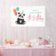 Cette bannière d'anniversaire de enfant mignonne et amusante est ornée d'un ours de panda, d'un casquette de fête et de ballons. Le panneau fournit des zones pour ajouter les détails de votre fête d'anniversaire dans un script minimaliste. Parfait pour l'anniversaire de n'importe quel amant de panda, idéal pour un 5ème anniversaire, mais entièrement personnalisable pour s'adapter aux amoureux des animaux plus âgés ou plus jeunes de la jungle.