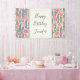 Bannière d'anniversaire avec une belle motif avec de jolies fleurs roses superposées sur une motif rayée composée de rayures bleues et crème.