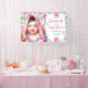 Banderole de bienvenue de baby shower fleurie personnalisée avec une petite fille sous une couverture fleurie. Jolies roses botaniques roses et feuilles verts, arcs et papillons roses et le tout avec un look aquarelle.
