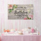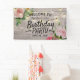 Joyeux décor de fête d'anniversaire Bienvenue Modèles de bannières - Élégant script avec fleurs roses roses et lumières à cordes sur Arrière - plan de bois rustique. Un design parfait pour votre grand jour. Tous les styles de texte, couleurs, tailles peuvent être modifiés selon vos besoins !