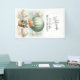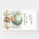 Adventure themed baby shower, vertical Welcome banner with an adorable fox holding a teddy bear riding in a green hot air balloon. The watercolor green sky has white clouds with surrounding gold stars. Template included.
