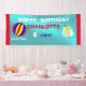 Une bannière d'anniversaire amusante pour une fête d'anniversaire avec des eaux bleu aqua chatoyantes, boule de plage rayée et de mignons châteaux de sable. Idéal pour les soirées piscine, plage ou baignade ; n'oubliez pas de modifier le texte pour ajouter un nom ou un message ou d'effacer si ce n'est pas nécessaire sans frais supplémentaires.