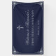 Une conception religieuse pour la première communion d'un garçon. L'arrière - plan est bleu marine. Il y a un faux cadre vintage de feuille d'argent et (faux) croix d'argent au-dessus du texte. Le message "Bienvenue chez [Nom]" est écrit dans un élégant script calligraphique, le reste en casquette. Tout le texte est gris. Le cadre vintage et orné est basé sur une reliure de livre française antique, par Georges Mercier (1885-1939) - Madame de Maupin par Theophile Gautier, édition 1911, maintenant dans le domaine public.