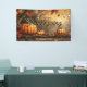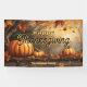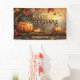 Cette bannière de Thanksgiving présente une belle scène peinte d'une forêt automnale ensoleillée. Un trio de citrouilles repose sur un rondin de bois rustique, entouré de feuilles épars dans des tons chauds et terreux. L'élégant script "Bon thanksgiving" et le nom de famille personnalisable ci-dessous en font une décoration personnalisée et accueillante, parfaite pour créer une ambiance chaleureuse et festive.