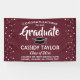 Add a personalized touch to college or high school graduation party decorations with a custom "Congratulations Graduate" maroon, white and black banner. All text on this template is simple to customize to include name, class year, school, degree, honors, inspirational quote, or other wording of your choice. The colors and font styles can be changed with the Zazzle design editor tool. The modern design features a maroon red background, black mortar board cap, festive cascading confetti dots, stylish script calligraphy, and elegant classic typography. This large graduation party sign can be hung on a wall to welcome guests to the celebration or used as a fun and stylish photo booth backdrop. Congratulations to the graduate!