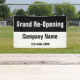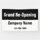 Une bannière permet à tout le monde de savoir que votre entreprise a rouvert. Le texte blanc en haut indique "Grand Re-Ouverture". Le texte blanc est sur une bande noire. Une bande blanche en bas contient du texte noir pour le nom commercial et le numéro de téléphone.