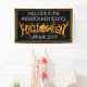 Bannière Halloween en noir et orange cool hantée maison ou carnaval avec votre propre texte personnalisé en police en détresse. Les éffrayantes lettres orange se courbent autour d'une Jack-o'-lantern au centre du mot. Personnalisez avec votre nom de famille pour une fête en octobre sur ce décor extérieur personnalisé déplaisant.