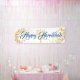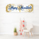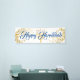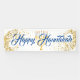 Cette bannière de vacances est présentée dans le style intérieur. Choisissez à l'intérieur ou à l'extérieur, avec ou sans grommets. Montré en blanc avec le texte bleu "Happy Hanoukka" dans un script sophistiqué avec deux tourbillons d'étoiles à l'aspect or à chaque extrémité. Customisez ou achetez comme prévu.