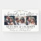 Bienvenue invités mariages à votre cérémonie ou réception avec une élégante bannière personnalisée 3 photo collage. Les images et tout le texte sont simples à personnaliser. (CONSEIL EN MATIÈRE DE PLACEMENT D'IMAGE : Une façon simple de centrer une photo exactement comment vous voulez est de la rogner avant de la télécharger sur le site Zazzle.) Le design moderne minimaliste noir et blanc comprend trois images de votre choix, une calligraphie de script de style manuscrit chic, une typographie vintage élégante, un coeur mignon en feuille d'or, et des messages personnalisables qui lisent "bienvenue à notre heureux toujours après" et "merci de célébrer avec nous." Ce panneau d'entrée mariage est une façon élégante de partager des photos de fiançailles tout en ajoutant une touche personnalisée à vos décorations de fête du jour. Félicitations à la mariée et au marié !