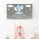 Fichier de fond pour éléphant personnalisable avec des flocons de neige et des nuages pour un baby shower d'hiver, personnalisable avec nom date et. Idéal pour la décoration des tables de desserts. Très mignon éléphant garçon avec casquette d'hiver et foulard.