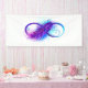 Symbole de l'infini avec une belle plume peinte en couleurs vives violettes et bleues sur fond blanc.