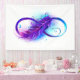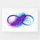 Infinity symbole with a beautiful feather painted in purple and blue bright colors on white background