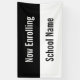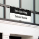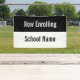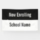 La bannière This Now Enroll a une bande noire en haut. Le texte d'affichage blanc se trouve sur la bande noire. La bande inférieure est blanche et a du texte noir pour le nom de l'école. Tout le texte peut être modifié ou supprimé.