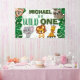 Votre petit garçon ou petite fille fête son premier anniversaire ? Ce design Wild One est parfait pour leur 1er anniversaire. Le thème safari jungle présente un singe, un paresseux, un éléphant, un lion et une girafe illustrés en style cartoon ! Faites la fête avec ce design vert feuillu, qui fait une superbe toile de fond pour les photos.