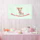 Banderole de Noël avec l'illustration d'un adorable cerf de bébé. Grands yeux grands oreilles avec une grande tête et des petits bois bruns. Portant un gros arc rouge. À côté d'une pile de cadeaux.