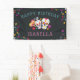 Célébrez un anniversaire spécial avec cette bannière personnalisée cool, avec "happy anniversaire [name]" sur un arrière - plan noir foncé orné de fleurs colorées, de crânes à sucre décorés de manière complexe, et de maracas. Conçu pour coordonner avec nos invitations à la fête d'anniversaire Dia de los Muertos pour le thème de la Journée des Morts ou les fêtes d'anniversaire de la saison d'Halloween.