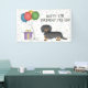 Design à thème d'anniversaire mignon avec l'illustration originale de Destei d'un chien de race Dachshund couleur noir et tan. A côté du chien il y a des ballons colorés d'anniversaire attachés sur un os de chien et une boîte cadeau de couleur violet et jaune. L'arrière - plan a un motif ludique de confettis pastel colorés sur un arrière - plan blanc. Vous trouverez également une zone de texte personnalisable.